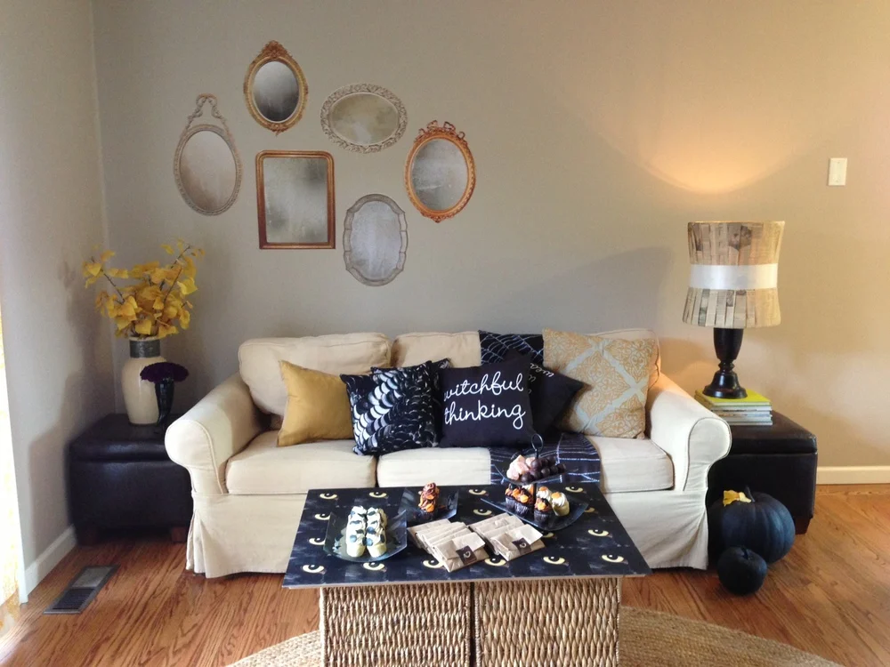 This two tiered tray is made out of Shutterfly curved glass prints, the pillows in the background are all Shutterfly and the table with the cat eyes is made out of Shutterfly's wooden wall art that I photoshopped a pattern onto.