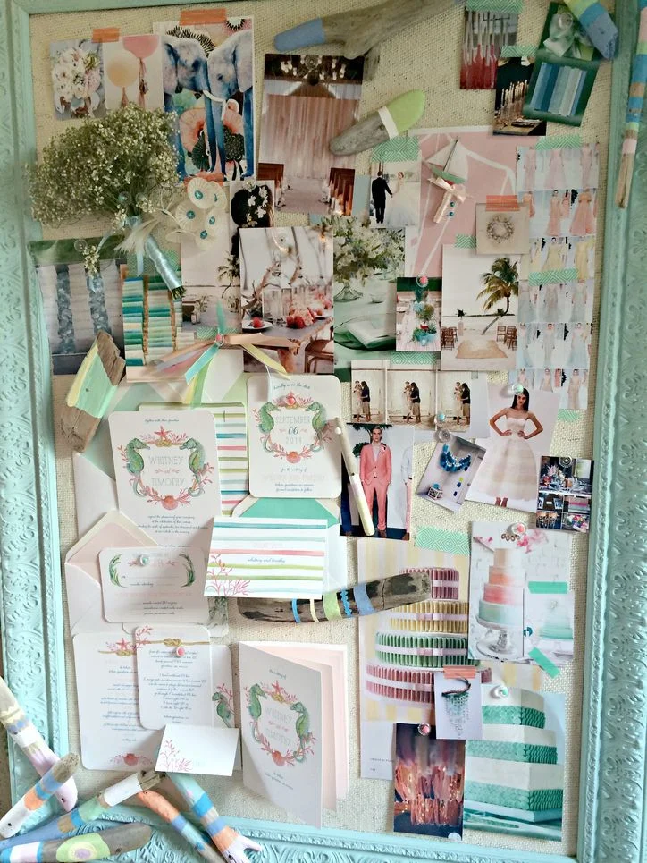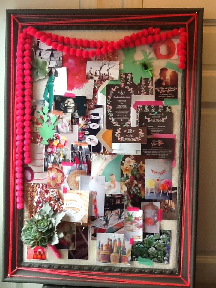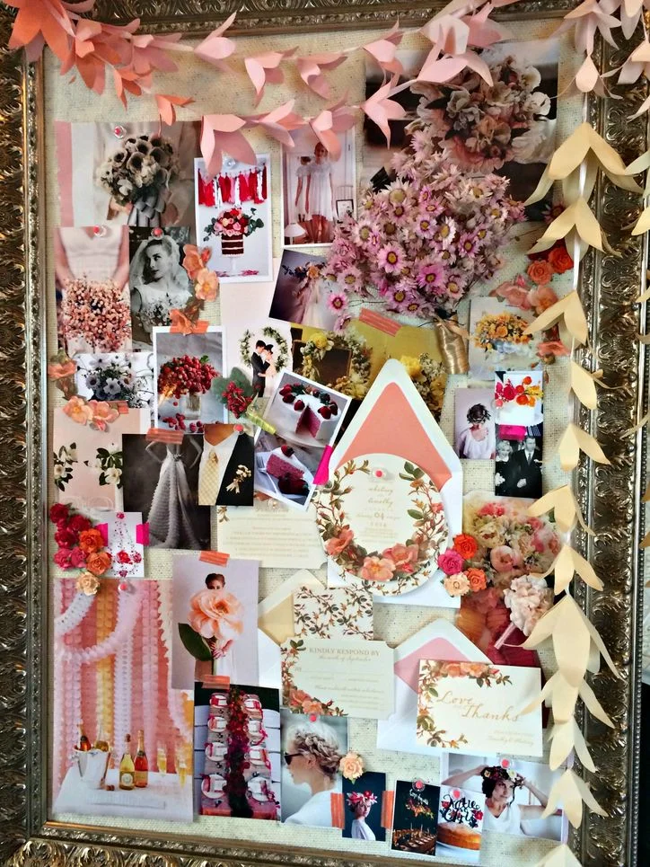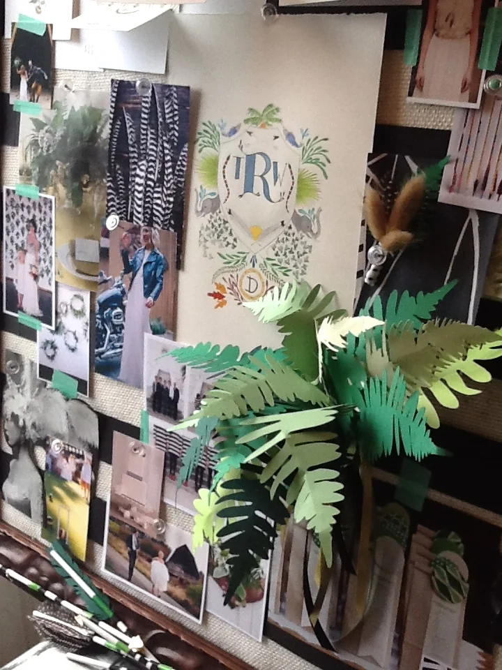 I made each of the four frames giant pin boards. I cut out paper flowers for garlands, used real succulents and dried florals for bouquets, really just put a ton of moxie in each one. I made four different wedding invitation suites to go with each design. my talented illustrator friend megan gnekow made a custom crest for whitney which she loved. you can see it on the boho chic board.